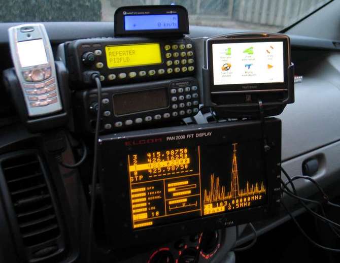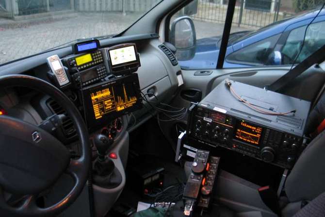 Later is de apparatuur verplaatst naar de kofferruimte van deze bus en d.m.v. vijf glasvezelkabels verbonden met het scherm op het dashboard en de bediening tussen de stoelen. Het plasma scherm laat zien wat voor signalen er in Ether aanwezig zijn. Het was voor mij dus niet zo heel moeilijk. Deze apparatuur zat in de jaren 80 al in de voertuigen van de Radio Controle Dienst. Oh, wat heb ik deze vroeger vervloekt. Aan de andere kant was het ook niet zo moeilijk om uit te vinden waar destijds mijn verboden zendertje zich bevond met die hoge masten in Amsterdam. Het rechter deel van het scherm is een spectrum analyzer met de grote middelste piek radio Veronica op 103 Mhz vanuit de toren Lelystad. Op de bijrijdersstoel een computer met een 386 processor en daar boven een icom R9000 ontvanger en daarvoor de bediening. Later is hier nog een doppler pijler (direction finder) aan toegevoegd die keurig aangaf uit welke richting het signaal vandaan kwam. Ik heb op dit moment nog drie van deze sets in mijn bezit.